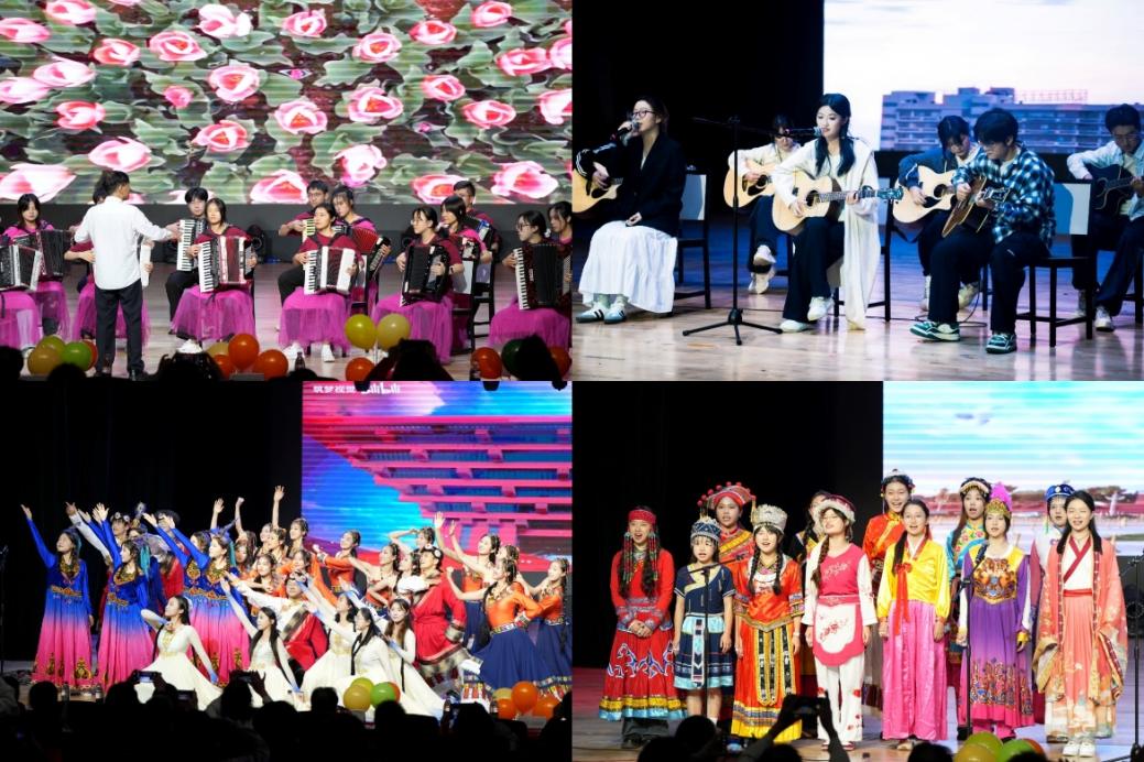 演出尾声,氛围推向高潮。手风琴合奏《我和我的祖国》以熟悉旋律唤醒家国情怀,民族舞《再唱山歌给党听》用优美舞姿描绘民族团结的美好画卷,朗诵《诗意中国》则以深情告白传递对祖国的赤诚热爱。最终,全场在望江声乐班《天耀中华》的恢弘歌声中落下帷幕,激昂的旋律里满含对祖国的深切祝福,为展演画上圆满句点。