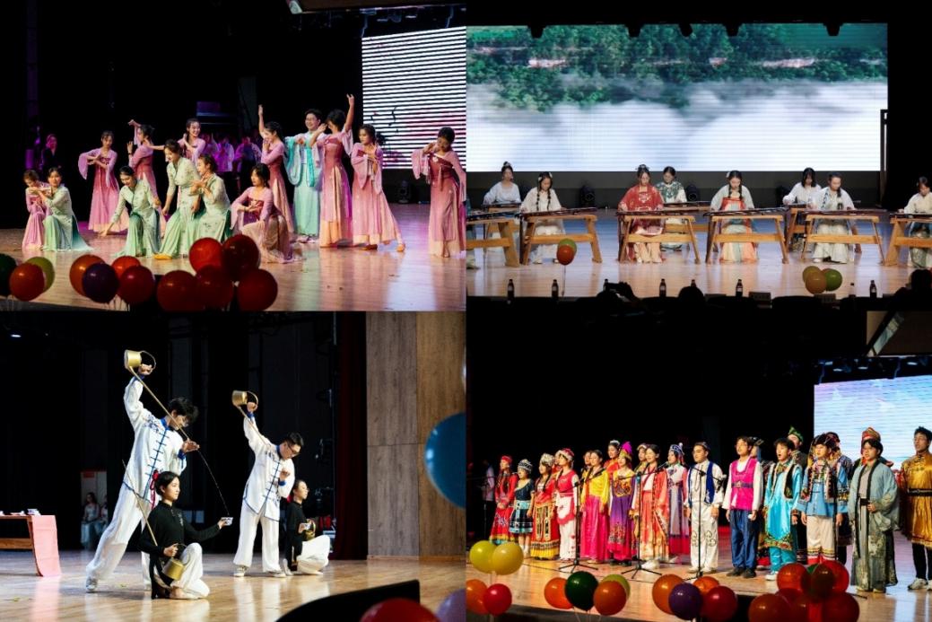 本次汇报展演以“非遗文化与美育融合”为主线,分篇章呈现了一场多元交融、精彩纷呈的艺术盛宴。开篇以《龙狮变,鼓乐天》点燃全场,舞狮的憨劲、川剧变脸的奇幻与狮鼓的激昂交织融合,将非遗技艺的魅力展现得淋漓尽致;随后,刚劲有力的武术表演展现中华武术魂,长嘴壶茶艺演绎东方生活美学,韵味悠长的古典舞尽显东方韵律之美。